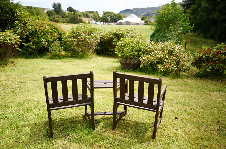 Our outside seating area looks on to a local playing field with Ben Tianavaig mountain in the background.